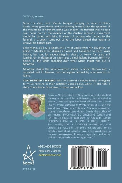 Before he died, Henri Morais thought changing his name to Henry Maris, doing good deeds and surrounding himself with the splendor of the mountains in northern Idaho was enough. He thought that his guilt over being part of the violence of the Quebec separatist movement would be buried with him. It wasn't. A woman who comes to the funeral, a stranger, turns out to be the loose thread that begins to unravel his hidden past. Ellen Maris, isn't sure whom she's most upset with: her daughter, for going to Montreal and digging up what had happened so many years before; her son, for encouraging his sister; or Henry, for dying and leaving her. In desperation, she starts a small baking business from her home, all the while brooding over what Marie might find out in Montreal. Montreal during the violence-prone sixties; a bomb thrown into a crowded café in Bahrain; two helicopters burned by eco-terrorists in Idaho. TWO-HEARTED CROSSING tells the story of a flawed family, struggling to move forward in their suddenly upside-down world. It also tells a story of resilience, of survival, of hope and of love.