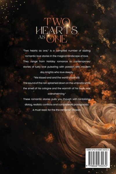 "Two hearts as one", is a compiled number of sizzling romantic love stories in the magical landscape of love. They range from Holiday romance to contemporary stories of lusty love pulsating with passion with modern day knights who love deeply. "We kissed and and the world stood still. The sound of the rain splashed down on the umbrella while the smell of his cologne and the warmth of his body was overwhelming". These romantic stories pulls you though with tantalizing dialog, realistic conflicts and complicated protagonists. A must read, for the the romantic at heart.