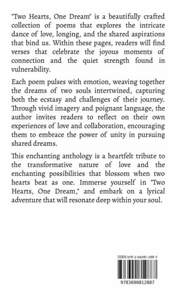 "Two Hearts, One Dream" is a beautifully crafted collection of poems that explores the intricate dance of love, longing, and the shared aspirations that bind us. Within these pages, readers will find verses that celebrate the joyous moments of connection and the quiet strength found in vulnerability. Each poem pulses with emotion, weaving together the dreams of two souls intertwined, capturing both the ecstasy and challenges of their journey. Through vivid imagery and poignant language, the author invites readers to reflect on their own experiences of love and collaboration, encouraging them to embrace the power of unity in pursuing shared dreams. This enchanting anthology is a heartfelt tribute to the transformative nature of love and the enchanting possibilities that blossom when two hearts beat as one. Immerse yourself in "Two Hearts, One Dream," and embark on a lyrical adventure that will resonate deep within your soul.