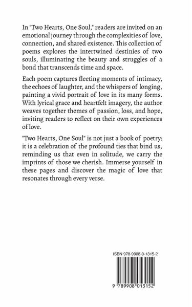 In "Two Hearts, One Soul," readers are invited on an emotional journey through the complexities of love, connection, and shared existence. This collection of poems explores the intertwined destinies of two souls, illuminating the beauty and struggles of a bond that transcends time and space. Each poem captures fleeting moments of intimacy, the echoes of laughter, and the whispers of longing, painting a vivid portrait of love in its many forms. With lyrical grace and heartfelt imagery, the author weaves together themes of passion, loss, and hope, inviting readers to reflect on their own experiences of love. "Two Hearts, One Soul" is not just a book of poetry; it is a celebration of the profound ties that bind us, reminding us that even in solitude, we carry the imprints of those we cherish. Immerse yourself in these pages and discover the magic of love that resonates through every verse.