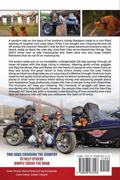 A random ride on the back of her brother's Harley-Davidson leads to a rum-filled evening of laughter and crazy ideas. What if we bought two motorcycles and set off across the country? Wouldn't that be fun? A great adventure! Everyone was on board, ready to leave the next day. And then they remembered two things. They didn't know how to ride motorcycles and there were two very large Golden Retrievers that do not fit on motorcycles. The author takes you on an incredible, unforgettable 218-day journey through all lower 48 states with the dogs riding in sidecars. Wearing goofy smiles, goggles, and flag bandanas, Max and Bailey win the hearts of everyone who meets them as they race across this great nation to help others simply cross the road. Follow along as these two dogs take you on a journey of a lifetime through America's back roads to visit quirky tourist attractions, iconic American landmarks, and interesting places in small town America while raising money and educating people about how Assistance Dogs profoundly impact the lives of people living with disabilities. The triumphs will have you cheering. The moments of struggle will leave you wondering why they didn't quit. However, the people they meet and the lives they changed will leave you with a renewed understanding of how powerful one crazy idea can become and will help you rediscover the heart of America.