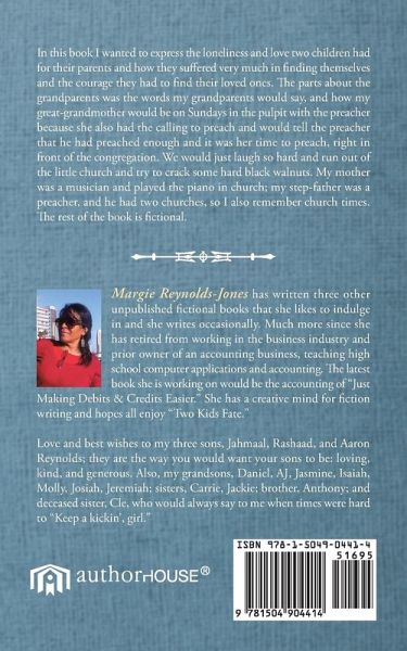 Margie Reynolds-Jones has written three other unpublished fictional books that she likes to indulge in and she writes occasionally. Much more since she has retired from working in the business industry and prior owner of an accounting business, teaching high school computer applications and accounting. The latest book she is working on would be the accounting of "Just Making Debits & Credits Easier." She has a creative mind for fiction writing and hopes all enjoy "Two Kids Fate." Love and best wishes to my three sons, Jahmaal, Rashaad, and Aaron Reynolds; they are the way you would want your sons to be: loving, kind, and generous. Also, my grandsons, Daniel, AJ, Jasmine, Isaiah, Molly, Josiah, Jeremiah; sisters, Carrie, Jackie; brother, Anthony; and deceased sister, Cle, who would always say to me when times were hard to "Keep a kickin', girl."