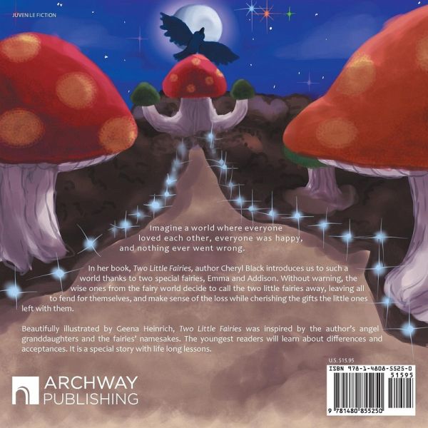Imagine a world where everyone loved each other, everyone was happy, and nothing ever went wrong. In her book, Two Little Fairies, author Cheryl Black introduces us to such a world thanks to two special fairies, Emma and Addison. Without warning, the wise ones from the fairy world decide to call the two little fairies away, leaving all to fend for themselves, and make sense of the loss while cherishing the gifts the little ones left with them. Beautifully illustrated by Geena Heinrich, Two Little Fairies was inspired by the author’s angel granddaughters and the fairies’ namesakes. The youngest readers will learn about differences and acceptances. It is a special story with life long lessons.