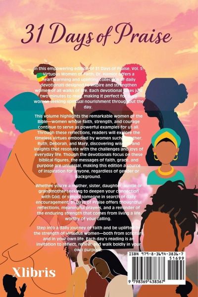 In this empowering edition of 31 Days of Praise, Vol. 5: Virtuous Women of Faith, Dr. Hamlor offers a heartwarming and uplifting collection of daily devotionals designed to inspire and strengthen women of all walks of life. Each devotional takes just two minutes to read, making it perfect for busy women seeking spiritual nourishment throughout the day. This volume highlights the remarkable women of the Bible-women whose faith, strength, and courage continue to serve as powerful examples for us all. Through these reflections, readers will explore the timeless virtues embodied by women such as Esther, Ruth, Deborah, and Mary, discovering wisdom and insights that resonate with the challenges and joys of everyday life. Though the devotionals focus on these biblical figures, the messages of faith, grace, and purpose are universal, making this edition a source of inspiration for anyone, regardless of gender or background. Whether you're a mother, sister, daughter, auntie or grandmother seeking to deepen your connection with God, or simply someone in search of daily encouragement, 31 Days of Praise offers thoughtful reflections, meaningful prayers, and a reminder of the enduring strength that comes from living a life worthy of your calling. Step into a daily journey of faith and be uplifted by the strength of virtuous women-both from scripture and in your own life. Each day's reading is an invitation to reflect, renew, and walk boldly in your own purpose.