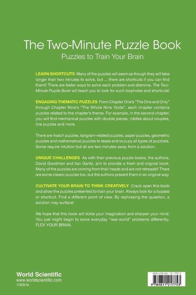 LEARN SHORTCUTS Many of the puzzles will seem as though they will take longer than two minutes to solve, but ... there are shortcuts if you can find them!! There are faster ways to solve each problem and dilemma. The Two-Minute Puzzle Book will teach you to look for such loopholes and shortcuts! ENGAGING THEMATIC PUZZLES From Chapter One's "The One and Only" through Chapter Nine's "The Whole Nine Yards", each chapter contains puzzles related to the chapter's theme. For example, in the second chapter, you will find mechanical puzzles with double pieces, riddles about couples, line puzzles and more. There are match puzzles, tangram-related puzzles, paper puzzles, geometric puzzles and mathematical puzzles to tease and occupy all types of puzzlists. Some require intuition but all are two minutes away from a solution. UNIQUE CHALLENGES As with their previous puzzle books, the authors, David Goodman and Ilan Garibi, aim to provide a fresh and original book. Many of the puzzles are coming from their heads and are not retreads!! There are some classic puzzles too, but the authors present them in an original way. CULTIVATE YOUR BRAIN TO THINK CREATIVELY Crack open this book and allow the puzzles presented to train your brain. Always look for a bypass or shortcut. Find a different point of view. By rephrasing the question, a solution may surface! We hope that this book will tickle your imagination and sharpen your mind. You just might begin to solve everyday "real-world" problems differently. FLEX YOUR BRAIN.