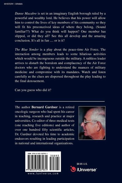 Danse Macabre is set in an imaginary English borough ruled by a powerful and wealthy lord. He believes that his power will allow him to control the lives of key members of his community so they will fit his preconceived ideas of where they belong. (Sound familiar??) What do you think will happen? One member has slipped, or did they all? See this all develop and the amazing conclusion. It's all in fun . or is it? The Blue Yonder is a play about the peace-time Air Force. The interaction among members leads to some hilarious activities which would be incongruous outside the military. A ruthless leader arrives to disturb the boredom and complacency of the Air Force doctors who are fighting to understand the nuances of military medicine and compromise with its mandates. Watch and listen carefully as the clues are dispersed throughout the play leading to the final denouement. Can you guess who did it?