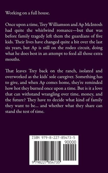 Working on a full house. Once upon a time, Trey Williamson and Ap McIntosh had quite the whirlwind romance-but that was before family tragedy left them the guardians of five kids. Their lives have changed quite a bit over the last six years, but Ap is still on the rodeo circuit, doing what he does best in an attempt to feed all those extra mouths. That leaves Trey back on the ranch, isolated and overworked as the kids' sole caregiver. Something has to give, and when Ap comes home, they're reminded how hot they burned once upon a time. But is it a love that can withstand wrangling over time, money, and the future? They have to decide what kind of family they want to be... and whether what they share can stand the test of time.