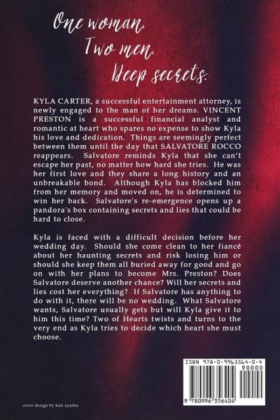 One woman. Two Men. Deep Secrets. KYLA CARTER, a successful entertainment attorney, is newly engaged to the man of her dreams. VINCENT PRESTON is a successful financial analyst and romantic at heart who spares no expense to show Kyla his love and dedication. Things are seemingly perfect between them until the day that SALVATORE ROCCO reappears. Salvatore reminds Kyla that she can't escape her past, no matter how hard she tries. He was her first love and they share a long history and an unbreakable bond. Although Kyla has blocked him from her memory and moved on, he is determined to win her back. Salvatore's re-emergence opens up a pandora's box containing secrets and lies that could be hard to close. Kyla is faced with a difficult decision before her wedding day. Should she come clean to her fiancé about her haunting secrets and risk losing him or should she keep them all buried away for good and go on with her plans to become Mrs. Preston? Does Salvatore deserve another chance? Will her secrets and lies cost her everything? If Salvatore has anything to do with it, there will be no wedding. What Salvatore wants, Salvatore usually gets but will Kyla give it to him this time? Two of Hearts twists and turns to the very end as Kyla tries to decide which heart she must choose.