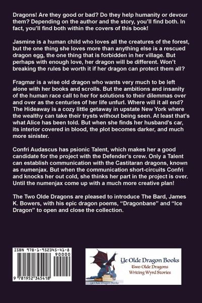 Dragons! Are they good or bad? Do they help humanity or devour them? Depending on the author and the story, you'll find both. In fact, you'll find both within the covers of this book! Jasmine is a human child who loves all the creatures of the forest, but the one thing she loves more than anything else is a rescued dragon egg, the one thing that is forbidden in her village. But perhaps with enough love, her dragon will be different. Won't breaking the rules be worth it if her dragon can protect them all? Fragmar is a wise old dragon who wants very much to be left alone with her books and scrolls. But the ambitions and insanity of the human race call to her for solutions to their dilemmas over and over as the centuries of her life unfurl. Where will it all end? The Hideaway is a cozy little getaway in upstate New York where the wealthy can take their trysts without being seen. At least that's what Alice has been told. But when she finds her husband's car, its interior covered in blood, the plot becomes darker, and much more sinister. Confri Audascus has psionic Talent, which makes her a good candidate for the project with the Defender's crew. Only a Talent can establish communication with the Castitaran dragons, known as numenjax. But when the communication short-circuits Confri and knocks her out cold, she thinks her part in the project is over. Until the numenjax come up with a much more creative plan! The Two Olde Dragons are pleased to introduce The Bard, James K. Bowers, with his epic dragon poems, "Dragonbane" and "Ice Dragon" to open and close the collection.