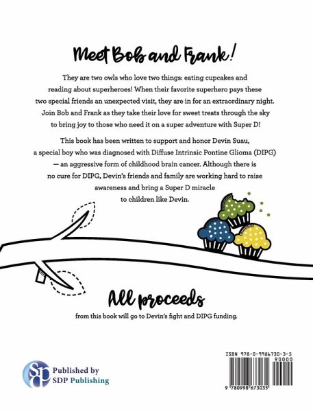 Meet Bob and Frank! They are two owls who love two things: eating cupcakes and reading about superheroes! When their favorite superhero pays these two special friends an unexpected visit, they are in for an extraordinary night. Join Bob and Frank as they take their love for sweet treats through the sky to bring joy to those who need it on a super adventure with Super D! This book has been written to support and honor Devin Suau, a special boy who was diagnosed with Diffuse Intrinsic Pontine Glioma (DIPG)—an aggressive form of childhood brain cancer. Although there is no cure for DIPG, Devin’s friends and family are working hard to raise awareness and bring a Super D miracle to children like Devin. All proceeds from this book will go to Devin's fight and DIPG funding.