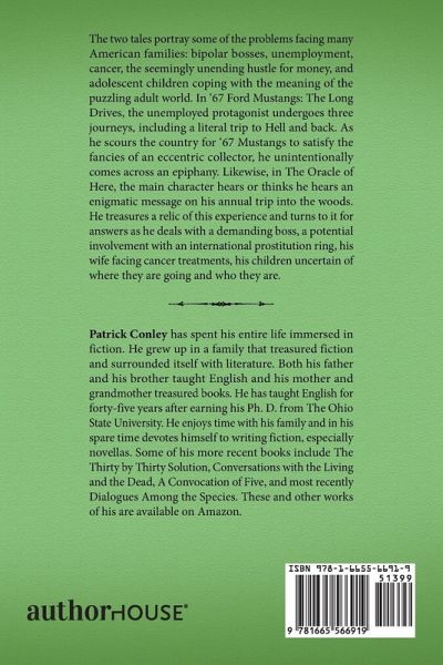 The two tales portray some of the problems facing many American families: bipolar bosses, unemployment, cancer, the seemingly unending hustle for money, and adolescent children coping with the meaning of the puzzling adult world. In '67 Ford Mustangs: The Long Drives, the unemployed protagonist undergoes three journeys, including a literal trip to Hell and back. As he scours the country for '67 Mustangs to satisfy the fancies of an eccentric collector, he unintentionally comes across an epiphany. Likewise, in The Oracle of Here, the main character hears or thinks he hears an enigmatic message on his annual trip into the woods. He treasures a relic of this experience and turns to it for answers as he deals with a demanding boss, a potential involvement with an international prostitution ring, his wife facing cancer treatments, his children uncertain of where they are going and who they are.