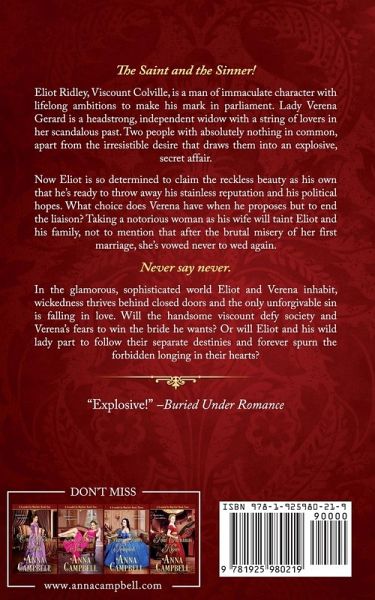 The Saint and the Sinner! Eliot Ridley, Viscount Colville, is a man of immaculate character with lifelong ambitions to make his mark in parliament. Lady Verena Gerard is a headstrong, independent widow with a string of lovers in her scandalous past. Two people with absolutely nothing in common, apart from the irresistible desire that draws them into an explosive, secret affair. Now Eliot is so determined to claim the reckless beauty as his own that he's ready to throw away his stainless reputation and his political hopes. What choice does Verena have when he proposes but to end the liaison? Taking a notorious woman as his wife will taint Eliot and his family, not to mention that after the brutal misery of her first marriage, she's vowed never to wed again. Never say never. In the glamorous, sophisticated world Eliot and Verena inhabit, wickedness thrives behind closed doors and the only unforgivable sin is falling in love. Will the handsome viscount defy society and Verena's fears to win the bride he wants? Or will Eliot and his wild lady part to follow their separate destinies and forever spurn the forbidden longing in their hearts?