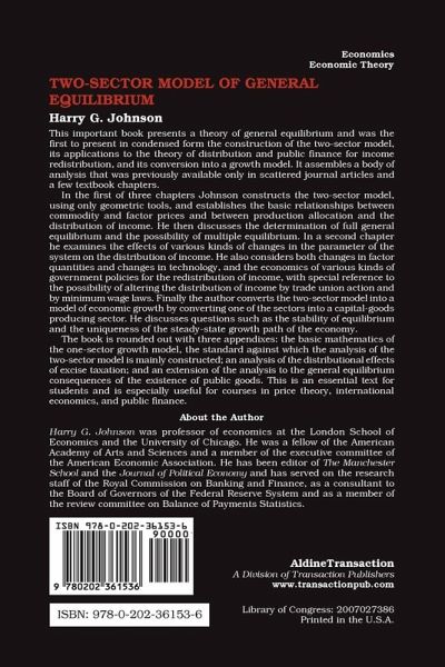 This important book presents a theory of general equilibrium and was the first to present in condensed form the construction of the two-sector model, its applications to the theory of distribution and public finance for income redistribution, and its conversion into a growth model. It assembles a body of analysis that was previously available only in scattered journal articles and a few textbook chapters. In the first of three chapters Johnson constructs the two-sector model, using only geometric tools, and establishes the basic relationships between commodity and factor prices and between production allocation and the distribution of income. He then discusses the determination of full general equilibrium and the possibility of multiple equilibrium. In a second chapter he examines the effects of various kinds of changes in the parameter of the system on the distribution of income. He also considers both changes in factor quantities and changes in technology, and the economics of various kinds of government policies for the redistribution of income, with special reference to the possibility of altering the distribution of income by trade union action and by minimum wage laws. Finally the author converts the two-sector model into a model of economic growth by converting one of the sectors into a capital-goods producing sector. He discusses questions such as the stability of equilibrium and the uniqueness of the steady-state growth path of the economy. The book is rounded out with three appendixes: the basic mathematics of the one-sector growth model, the standard against which the analysis of the two-sector model is mainly constructed; an analysis of the distributional effects of excise taxation; and an extension of the analysis to the general equilibrium consequences of the existence of public goods. This is an essential text for students and is especially useful for courses in price theory, international economics, and public finance.