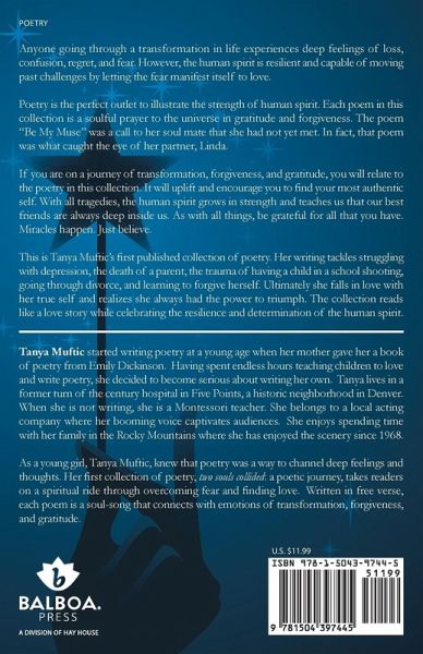 Anyone going through a transformation in life experiences deep feelings of loss, confusion, regret, and fear. However, the human spirit is resilient and capable of moving past challenges by letting the fear manifest itself to love. Poetry is the perfect outlet to illustrate the strength of human spirit. Each poem in this collection is a soulful prayer to the universe in gratitude and forgiveness. The poem Be My Muse was a call to her soul mate that she had not yet met. In fact, that poem was what caught the eye of her partner, Linda. If you are on a journey of transformation, forgiveness, and gratitude, you will relate to the poetry in this collection. It will uplift and encourage you to find your most authentic self. With all tragedies, the human spirit grows in strength and teaches us that our best friends are always deep inside us. As with all things, be grateful for all that you have. Miracles happen. Just believe. This is Tanya Muftics first published collection of poetry. Her writing tackles struggling with depression, the death of a parent, the trauma of having a child in a school shooting, going through divorce, and learning to forgive herself. Ultimately she falls in love with her true self and realizes she always had the power to triumph. The collection reads like a love story while celebrating the resilience and determination of the human spirit.