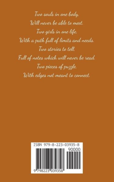Beth is smart, mature, successful and overly controlling. She has everything she wants and knows how life works. Any is emotional, clumsy and fragile. She lives her life the fullest, breathing it in like a cool autumn breeze. Beth has her life under control, Any lets things happen. They have a perfectly balanced and strictly planned life, sharing one body... but He enters theit lives... "Two souls in one body, Will never be able to meet. Two girls in one life, With a path full of limits and needs. Two stories to tell, Full of notes which will never be read. Two pieces of puzzle, With edges not meant to connect."