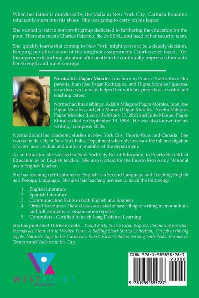 When her father is murdered by the Mafia in New York City, Carmela Bonanno reluctantly steps into his shoes. She was going to carry on his legacy. She wanted to start a non-profit group dedicated to furthering education for the poor. There she meets Charles Palermo, the ex-SEAL, and head of her security team. She quickly learns that coming to New York might prove to be a deadly decision. Keeping her alive is one of the toughest assignments Charles ever faced. Yet through one disturbing situation after another, she continually impresses him with her strength and inner courage. Norma Iris Pagan Morales was born in Ponce, Puerto Rico. Her parents, Juan Jose Pagan Rodriguez, and Digna Morales Figueroa, now deceased, always helped her with her projects as a writer and teaching career. Norma had three siblings, Adelin Milagros Pagan Morales, Juan Jose Pagan Morales, and Julio Manuel Pagan Morales. Adelin Milagros Pagan Morales died on February 17, 2023, and Julio Manuel Pagan Morales died on September 19, 1998. He was also known for his writing/composing skills. Norma did all her academic studies in New York City, Puerto Rico, and Canada. She worked in the City of New York Police Department where she oversaw the full investigation of every new civilian and uniform member of the department. As an Educator, she worked in New York City Bd. of Education, in Puerto Rico Bd. of Education as an English teacher. She also worked for the Puerto Rico Army National as an English Teacher. She has teaching certifications for English as a Second Language and Teaching English as a Foreign Language. She also has teaching licenses to teach the following: 1. English Literature 2. Spanish Literature 3. Communication Skills in both English and Spanish 4. Office Procedures= These classes consisted of basic filing to writing memorandums and full company or organization reports. 5. Computers - Certified to teach Long Distance Learning She has published Thirteen books: Proud of My Puerto Rican Bequest, Porque Soy Boricua? Poemas del Alma, Art in Writt en Form, A Baffl ing Short Stories Collection, On Job in the Big Apple, Nature's Rage in the Caribbean, Puerto Rican Soldiers Serving with Pride, Poemas de Ternura, and Violence in the City.