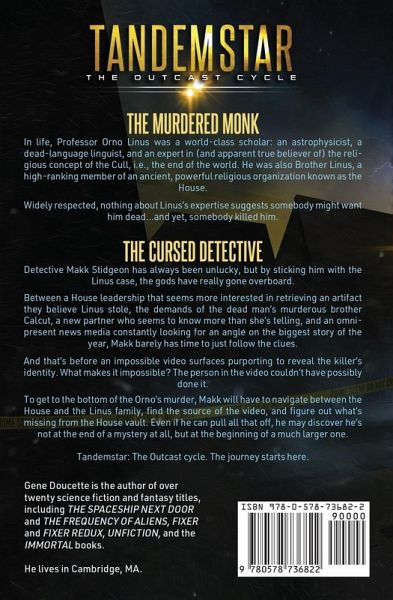 Welcome to Dib! Dib is an Earthlike planet, only slightly smaller, with shorter days and longer years, in orbit around twin suns. On the continent of Geo, in the city of Velon in the nation of Inimata, a man lies dead in his study. The Murdered Monk In life, Professor Orno Linus was a world-class scholar: an astrophysicist, a dead-language linguist, and an expert in (and apparent true believer of) the religious concept of the Cull, i.e., the end of the world. Widely respected, nothing about Linus's expertise suggests somebody might want him dead. Professor Linus is also Brother Linus, a high-ranking member of an ancient, powerful religious organization known as the House. This makes his murder much more complicated, but no more explicable, because murder on House grounds just doesn't happen. Not even when one of the last things the victim did was steal something important from the House vault. Finally, Orno is also the younger brother of Calcut Linus, one of the most powerful and criminally dangerous people on the planet. Killing any Linus means incurring the wrath of a man for whom laws very rarely apply. In short, Professor Orno Linus is a highly unlikely murder victim. And yet, somebody killed him. The Cursed Detective Detective Makk Stidgeon already knows he's unlucky. He's a cholem: an outcast. A bad-luck charm. He was born this way, and has the brand on his wrist to prove it. But in terms of bad luck, the gods have really gone overboard by sticking him with the Linus case. Between a House leadership that seems more interested in retrieving their stolen artifact than in solving the murder of one of their own, the demands of the murderous Calcut Linus, a new partner who seems to know more than she's telling, and an omnipresent news media constantly looking for an angle on the biggest story of the year, Makk barely has time to just follow the clues. And that's before an impossible video surfaces that purports to reveal the killer's identity. What makes it impossible? The person in the video couldn't have possibly done it. To get to the bottom of the Orno's murder, Makk will have to navigate between the House and the Linus family, find the source of the video, and figure out what's missing from the House vault. Even if he can pull all that off, he may discover he's not at the end of a mystery at all, but at the beginning of a much larger one. Tandemstar: The Outcast Cycle. The journey begins here.