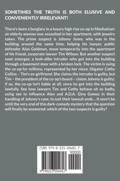 SOMETIMES THE TRUTH IS BOTH ELUSIVE AND CONVENIENTLY IRRELEVANT! There's been a burglary in a luxury high rise co-op in Manhattan: an elderly woman was assaulted in her apartment, with jewelry taken. The prime suspect is Johnny Jones, who was in the building around the same time, helping his lawyer, public defender Alan Goldman, move temporarily into the apartment of his friend, corporate lawyer Tim Wilson. But another suspect soon emerges: a look-alike intruder who got into the building through a basement door with a broken lock. The victim is suing the co-op for millions, represented by her niece, litigator Cathy Collins – Tim's ex-girlfriend. She claims the intruder is guilty, but Tim – the president of the co-op's board – claims Johnny is guilty; if so, the co-op isn't liable at all, since he got into the building lawfully. See how lawyers Tim and Cathy behave oh so badly, using sex to influence Alan and A.D.A. Gina Gomez in their handling of Johnny's case, to suit their lawsuit ends… It won't be until the very end of this dark-comedy mystery that the question will finally be answered: which of the two suspects is guilty?