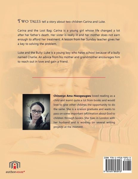 Two tales tell a story about two children Carina and Luke in Carina and the Lost Bag: Carina is a young girl whose life changed a lot after her father's death. Her sister is really ill and her mother does not earn enough to afford her treatment. A lesson from her Sunday teacher gives her a key to solving the problem. Luke and the Bully: Luke is a young boy who hates school because of a bully named Charlie. An advice from his mother and grandmother encourages him to reach out in love and gain a friend.