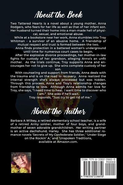 Two Tattered Hearts is a novel about a young mother, Anna Rodgers, who fears for her life as well as that of her infant son. Her husband turned their home into a man-made hell of physical, sexual, and emotional abuse. While at a bookstore near her work, Anna stumbles into Troy Whitman - a survivor of an abusive home. A friendship of mutual respect and trust is formed between the two. Anna finds protection in a battered woman's underground until time for numerous court cases to begin. After the explosive divorce proceedings, her mother-in-law fights for custody of her grandson, alleging Anna's an unfit mother. As the trials continue, Troy supports Anna and encourages her not to give up. She wins complete custody of her son. With counseling and support from friends, Anna deals with the trauma and is on the road to recovery. Anna realized the internal strength she's always processed but was hidden. Through this process, Anna and Troy's relationship changes from friendship to love. Although Anna admits her love for Troy, she says, "I need time to heal. I want time to discover who I am." She asks if he'll wait. Troy responds, "Just try to get rid of me."