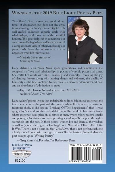 Two-Toned Dress shows us good times, times of abundance, but does not shy away from showing the lonely times. Dig in! This well-crafted collection expertly deals with relationships, and does so with beautiful honesty. This poet helps us to remember our own times of being in love and leads us toward a compassionate view of others, including our parents, who have also known what it is to negotiate what life throws at us. Lucy Adkins grew up in rural Nebraska, received her undergraduate degree from Auburn University, and her MFA in Creative Writing in 2016 from the University of Nebraska at Omaha. Her poetry has been published in many journals, including Rhino, Northeast, South Dakota Review, Concho River Review, and the anthologies Woven on the Wind, Times of Sorrow/Times of Grace, Crazy Woman Creek, and the Poets Against the War anthology. Her chapbook, One Life Shining: Addie Finch, Farmwife was published by Pudding House Press. She has also co-authored a book of non-fiction, Writing in Community, which won an "Ippy" in the Independent Publisher’s Book Awards.