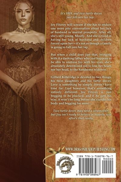 It's 1819, and two turtle doves just fell into her lap... Joy Fitzroy will scream if she has to endure one more pity conversation about her lack of husband or marital prospects. After all, she's still young. Mostly. And she is tired of having her lack of husband and children forced upon her-it's not as though a family is going to fall into her lap. But when a child does just that, bringing with it a dashing father who just happens to be able to undress Joy with his eyes, she's absolutely determined not to lose her heart, nor her head, to the handsome widower. Gilbert Kitteridge is devoted to two things, his twin daughters and his turtle doves. Love is something he simply doesn't have time for. Lust however, that's something entirely different. Joy Fitzroy is just begging to be plucked, and if he gets his way, it won't be long before she's under his body and begging for more... Two turtle doves may need a stepmother, but Joy isn't ready to believe in happily ever after's that easily. This novella is a steamy Regency romance with a happily ever after, no cliffhangers, and is part of a series which can be read in any order - but follow the numbers down for the best reading experience! Note: This series is part of Dragonblade's Flame line, so this is a sexy, steamy, and scorching-hot read with multiple sex scenes. Be advised. The Twelve Days of Christmas Book 1 - Twelve Drummers Drumming Book 2 - Eleven Pipers Piping Book 3 - Ten Lords a Leaping Book 4 - Nine Ladies Dancing Book 5 - Eight Maids a Milking Book 6 - Seven Swans a Swimming Book 7 - Six Geese a Laying Book 8 - Five Gold Rings Book 9 - Four Calling Birds Book 10 - Three French Hens Book 11 - Two Turtle Doves Book 12 - A Partridge in a Pear Tree