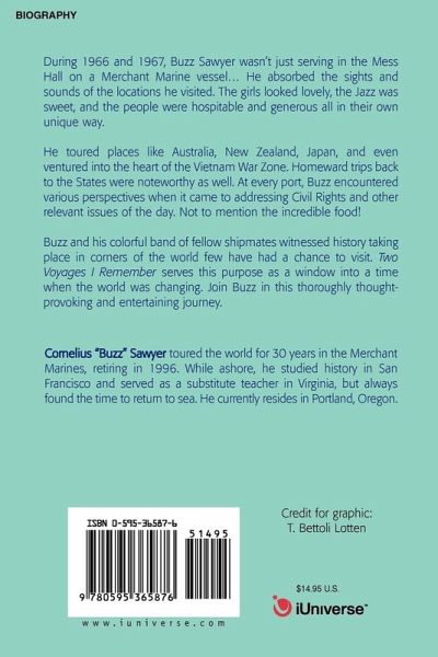 During 1966 and 1967, Buzz Sawyer wasn't just serving in the Mess Hall on a Merchant Marine vessel. He absorbed the sights and sounds of the locations he visited. The girls looked lovely, the Jazz was sweet, and the people were hospitable and generous all in their own unique way. He toured places like Australia, New Zealand, Japan, and even ventured into the heart of the Vietnam War Zone. Homeward trips back to the States were noteworthy as well. At every port, Buzz encountered various perspectives when it came to addressing Civil Rights and other relevant issues of the day. Not to mention the incredible food! Buzz and his colorful band of fellow shipmates witnessed history taking place in corners of the world few have had a chance to visit. Two Voyages I Remember serves this purpose as a window into a time when the world was changing. Join Buzz in this thoroughly thought-provoking and entertaining journey.