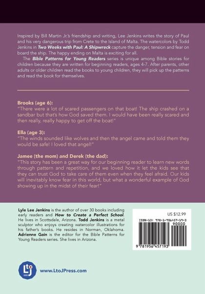 Inspired by Bill Martin Jr.'s friendship and writing, Lee Jenkins writes the story of Paul and his very dangerous trip from Crete to the Island of Malta. The watercolors by Todd Jenkins in Two Weeks with Paul: A Shipwreck capture the danger, tension and fear on board the ship. The happy ending on Malta is exciting for all. The Bible Patterns for Young Readers series is unique among Bible stories for children because they are written for beginning readers, ages 4-7. After parents, other adults or older children read the books to young children, they will pick up the patterns and read the book for themselves.