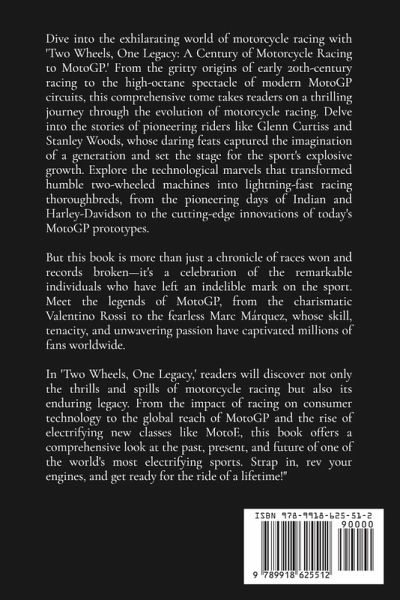 Dive into the exhilarating world of motorcycle racing with 'Two Wheels, One Legacy: A Century of Motorcycle Racing to MotoGP.' From the gritty origins of early 20th-century racing to the high-octane spectacle of modern MotoGP circuits, this comprehensive tome takes readers on a thrilling journey through the evolution of motorcycle racing. Delve into the stories of pioneering riders like Glenn Curtiss and Stanley Woods, whose daring feats captured the imagination of a generation and set the stage for the sport's explosive growth. Explore the technological marvels that transformed humble two-wheeled machines into lightning-fast racing thoroughbreds, from the pioneering days of Indian and Harley-Davidson to the cutting-edge innovations of today's MotoGP prototypes. But this book is more than just a chronicle of races won and records broken-it's a celebration of the remarkable individuals who have left an indelible mark on the sport. Meet the legends of MotoGP, from the charismatic Valentino Rossi to the fearless Marc Márquez, whose skill, tenacity, and unwavering passion have captivated millions of fans worldwide. In 'Two Wheels, One Legacy,' readers will discover not only the thrills and spills of motorcycle racing but also its enduring legacy. From the impact of racing on consumer technology to the global reach of MotoGP and the rise of electrifying new classes like MotoE, this book offers a comprehensive look at the past, present, and future of one of the world's most electrifying sports. Strap in, rev your engines, and get ready for the ride of a lifetime!"
