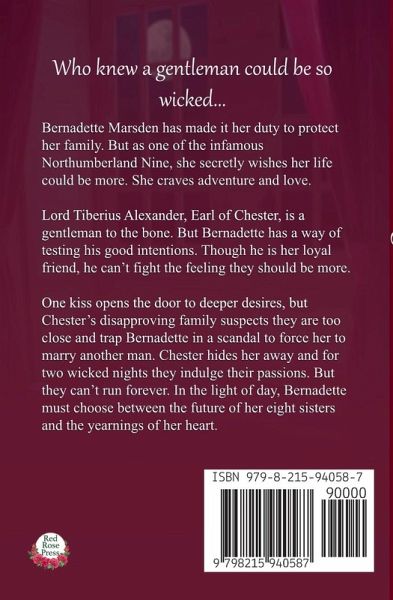 Will two wicked nights turn a loyal friendship into everlasting love …or tear them apart? Bernadette Marsden has made it her duty to protect her family. But as one of the infamous Northumberland Nine, she secretly wishes her life could be more. She craves adventure and love, but neither can be found in in the wilds of Northumberland unless she takes fate into her own hands. But can fate be controlled? Lord Tiberius Alexander, Earl of Chester, is a gentleman to the bone. But Bernadette has a way of testing his good intentions. Though he is her loyal friend, he can't fight the feeling they should be more. When a house party provides new gentlemen for Bernadette to meet, Chester must act on his feelings or lose her to another. One kiss opens the door to deeper desires, but Chester's family looks down on Bernadette for being poor gentry. To keep them apart, Bernadette is trapped in a scandalous situation to force her to marry another man. Chester hides her away, and for two wicked nights they indulge their passions. But they can't run forever. In the light of day, Bernadette must choose between the future of her eight sisters and the yearnings of her heart. Can Chester thwart his powerful family and save Bernadette or will their two nights together end in bittersweet memories? Two Wicked Nights is the second book in Dayna's new Regency Romance series, The Northumberland Nine. If you like a friends to lovers romance, strong heroines, and sizzling love scenes, then you'll love Dayna's new book. Romance awaits, read Two Wicked Nights today!