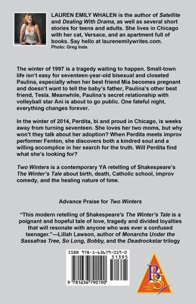The winter of 1997 is a tragedy waiting to happen. Small-town life isn't easy for seventeen-year-old, bisexual and closeted Paulina, especially when her best friend Mia becomes pregnant and doesn't want to tell the baby's father, Paulina's other best friend, Tesla. Meanwhile, Paulina's secret relationship with volleyball star Ani is about to go public. One fateful night, everything changes forever. In the winter of 2014, Perdita, bi and proud in Chicago, is weeks away from turning seventeen. She loves her two moms, but why won't they talk about her adoption? When Perdita meets improv performer Fenton, she discovers both a kindred soul and a willing accomplice in her search for the truth. Will Perdita find what she's looking for? Two Winters is a contemporary YA retelling of Shakespeare's The Winter's Tale about birth, death, Catholic school, improv comedy and the healing nature of time.