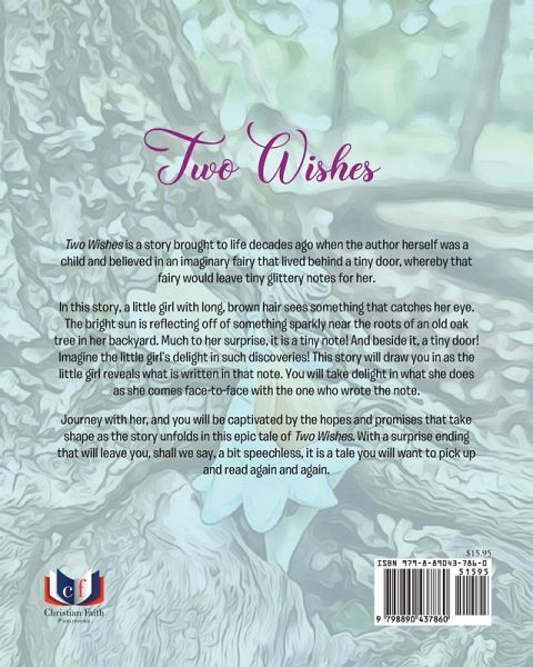 Two Wishes is a story brought to life decades ago when the author herself was a child and believed in an imaginary fairy that lived behind a tiny door, whereby that fairy would leave tiny glittery notes for her. In this story, a little girl with long, brown hair sees something that catches her eye. The bright sun is reflecting off of something sparkly near the roots of an old oak tree in her backyard. Much to her surprise, it is a tiny note! And beside it, a tiny door! Imagine the little girl's delight in such discoveries! This story will draw you in as the little girl reveals what is written in that note. You will take delight in what she does as she comes face-to-face with the one who wrote the note. Journey with her, and you will be captivated by the hopes and promises that take shape as the story unfolds in this epic tale of Two Wishes. With a surprise ending that will leave you, shall we say, a bit speechless, it is a tale you will want to pick up and read again and again.