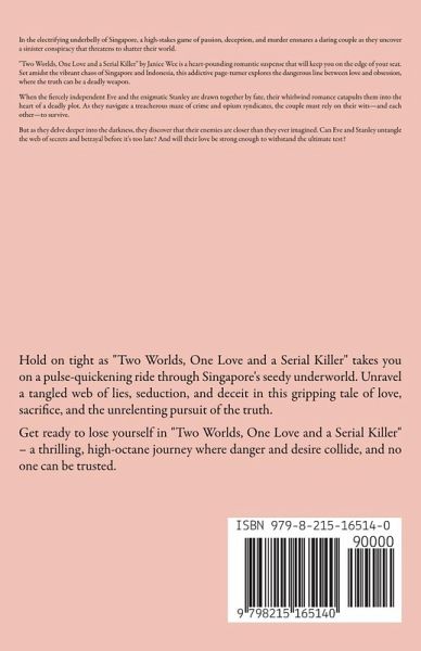 In the electrifying underbelly of Singapore, a high-stakes game of passion, deception, and murder ensnares a daring couple as they uncover a sinister conspiracy that threatens to shatter their world. "Two Worlds, One Love and a Serial Killer" by Janice Wee is a heart-pounding romantic suspense that will keep you on the edge of your seat. Set amidst the vibrant chaos of Singapore and Indonesia, this addictive page-turner explores the dangerous line between love and obsession, where the truth can be a deadly weapon. When the fiercely independent Eve and the enigmatic Stanley are drawn together by fate, their whirlwind romance catapults them into the heart of a deadly plot. As they navigate a treacherous maze of crime and opium syndicates, the couple must rely on their wits—and each other—to survive. But as they delve deeper into the darkness, they discover that their enemies are closer than they ever imagined. Can Eve and Stanley untangle the web of secrets and betrayal before it's too late? And will their love be strong enough to withstand the ultimate test? Hold on tight as "Two Worlds, One Love and a Serial Killer" takes you on a pulse-quickening ride through Singapore's seedy underworld. Unravel a tangled web of lies, seduction, and deceit in this gripping tale of love, sacrifice, and the unrelenting pursuit of the truth. Get ready to lose yourself in "Two Worlds, One Love and a Serial Killer" – a thrilling, high-octane journey where danger and desire collide, and no one can be trusted.