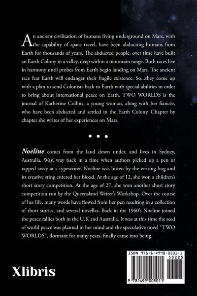 "An ancient civilisation of humans living underground on Mars, with the capability of space travel, have been abducting humans from Earth for thousands of years. The abducted people, over time have built an Earth Colony in a valley, deep within a mountain range. Both races live in harmony until probes from Earth begin landing on Mars. The ancient race fear Earth will endanger their fragile existence. So...they come up with a plan to send Colonists back to Earth with special abilities in order to bring about international peace on Earth. TWO WORLDS is the journal of Katherine Collins, a young woman, along with her fiancée, who have been abducted and settled in the Earth Colony. Chapter by chapter she writes of her experiences on Mars."