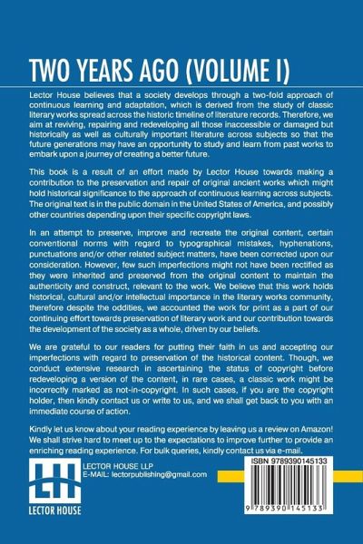Two Years Ago (Volume I): In Two Volumes, Vol. I. This book is a result of an effort made by us towards making a contribution to the preservation and repair of original classic literature. In an attempt to preserve, improve and recreate the original content, we have worked towards: 1. Type-setting & Reformatting: The complete work has been re-designed via professional layout, formatting and type-setting tools to re-create the same edition with rich typography, graphics, high quality images, and table elements, giving our readers the feel of holding a 'fresh and newly' reprinted and/or revised edition, as opposed to other scanned & printed (Optical Character Recognition - OCR) reproductions. 2. Correction of imperfections: As the work was re-created from the scratch, therefore, it was vetted to rectify certain conventional norms with regard to typographical mistakes, hyphenations, punctuations, blurred images, missing content/pages, and/or other related subject matters, upon our consideration. Every attempt was made to rectify the imperfections related to omitted constructs in the original edition via other references. However, a few of such imperfections which could not be rectified due to intentional\unintentional omission of content in the original edition, were inherited and preserved from the original work to maintain the authenticity and construct, relevant to the work. We believe that this work holds historical, cultural and/or intellectual importance in the literary works community, therefore despite the oddities, we accounted the work for print as a part of our continuing effort towards preservation of literary work and our contribution towards the development of the society as a whole, driven by our beliefs. We are grateful to our readers for putting their faith in us and accepting our imperfections with regard to preservation of the historical content. HAPPY READING!