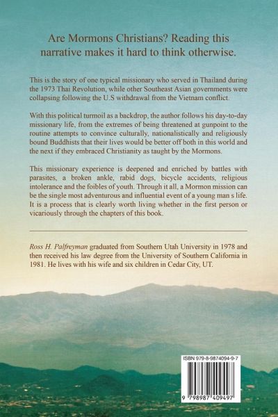This is the story of one typical missionary who served in Thailand during the 1973 Thai Revolution, while other Southeast Asian governments were collapsing following the U.S. withdrawal from the Vietnam conflict. With this political turmoil as a backdrop, the author follows his day-to-day missionary life, from the extremes of being threatened at gunpoint to the routine attempts to convince culturally, nationalistically and religiously bound Buddhists that their lives would be better off both in this world and the next if they embraced Christianity as taught by the Mormons. This missionary experience is deepened and enriched by battles with parasites, broken ankles, rabid dogs, bicycle accidents, religious intolerance and the foibles of youth. Through it all, a Mormon mission can be the single most adventurous and influential event of a young man's life. It is a process that is clearly worth living whether in the first person or vicariously through the chapters of this book.