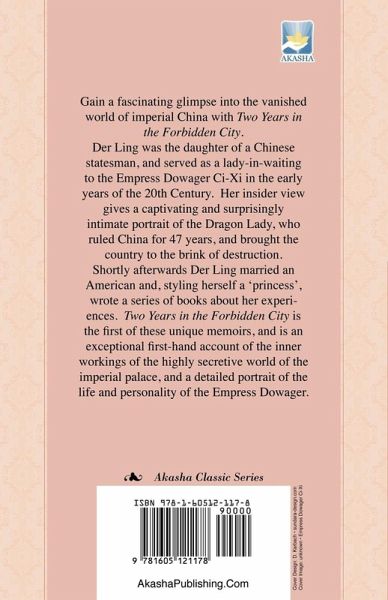 Two Years in the Forbidden City, by The Princess Der Ling - Akasha Classics, AkashaPublishing.Com - Gain a fascinating glimpse into the vanished world of imperial China with Two Years in the Forbidden City. Der Ling was the daughter of a Chinese statesman, and served as a lady-in-waiting to the Empress Dowager Ci-Xi in the early years of the 20th Century. Her insider view gives a captivating and surprisingly intimate portrait of the Dragon Lady, who ruled China for 47 years, and brought the country to the brink of destruction. Shortly afterwards Der Ling married an American and, styling…mehr