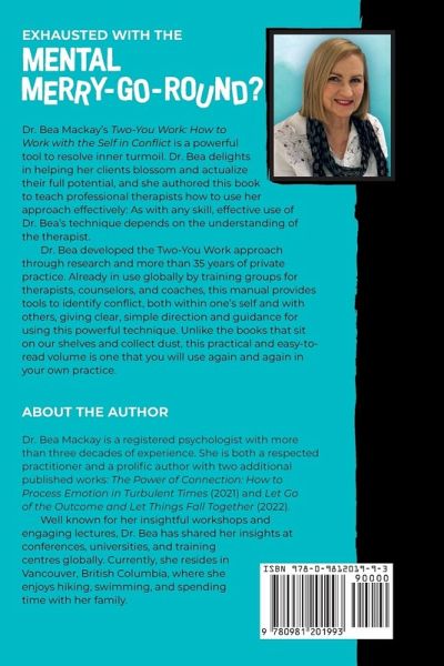 Exhausted with the mental merry-go-round? Dr. Bea Mackay's "Two-You Work: How to Work with the Self in Conflict" is a powerful tool to resolve inner conflict. She was inspired to write this book because she wanted professionals to learn how to use these tools effectively. Like knives in your kitchen drawers, how they are used depends on the skill set of the person using them. Her experience with "Two-You Work" was developed through her research and over 35 years of private practice. This manual provides a clear way to identify the struggles with conflict, both within one's self and with others. It gives clear, simple directions and guidance for using this powerful technique. Dr. Bea delights in helping her clients blossom and actualize their full potential. As therapists, we all have a variety of books that sit on our shelves and collect dust. This book has been designed to be practical and easy to read so that you can bring it into your practice. It is already used as a basic training manual for various therapist groups globally.