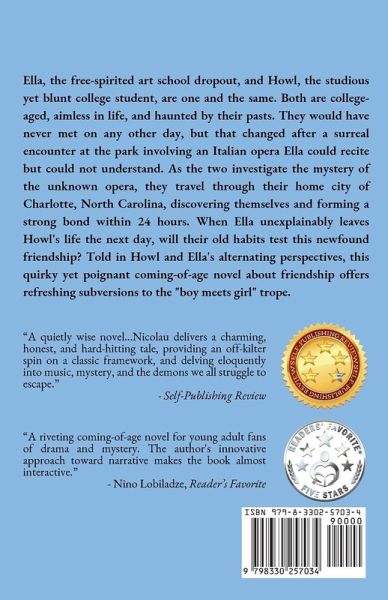 Ella, the free-spirited art school dropout, and Howl, the studious yet blunt college student, are one and the same. Both are college-aged, aimless in life, and haunted by their pasts. They would have never met on any other day, but that changed after a surreal encounter at the park involving an Italian opera Ella could recite but could not understand. As the two investigate the mystery of the unknown opera, they travel through their home city of Charlotte, North Carolina, discovering themselves and forming a strong bond within 24 hours. When Ella unexplainably leaves Howl's life the next day, will their old habits test this newfound friendship? Told in Howl and Ella's alternating perspectives, this quirky yet poignant coming-of-age novel about friendship offers refreshing subversions to the "boy meets girl" trope