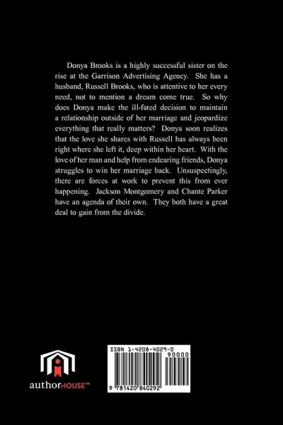 Donya Brooks is a highly successful sister on the rise at the Garrison Advertising Agency. She has a husband, Russell Brooks, who is attentive to her every need, not to mention a dream come true. So why does Donya make the ill-fated decision to maintain a relationship outside of her marriage and jeopardize everything that really matters? Donya soon realizes that the love she shares with Russell has always been right where she left it, deep within her heart. With the love of her man and help from endearing friends, Donya struggles to win her marriage back. Unsuspectingly, there are forces at work to prevent this from ever happening. Jackson Montgomery and Chante Parker have an agenda of their own. They both have a great deal to gain from the divide.