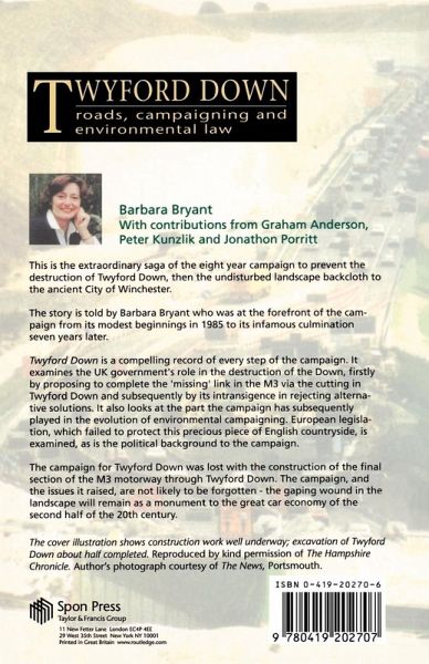 The Twyford Down story is set in a political and historical framework in order to examine the key issues affecting road planning and environmental protection: the system of route selection; Crown development; government agents, NGOs and locally elected authorities; conservation legislation; subsidiarity; lobbying techniques; and the role of the press. Written in a lively style and vividly illustrated, Twyford Down will appeal to environmental advisors, policy makers and planners as well as lobbyists and those interested in the environment.