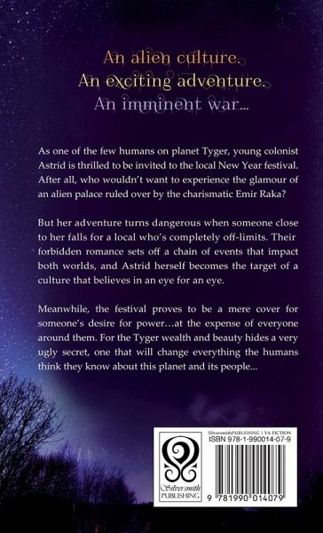 An alien culture. An exciting adventure. An imminent war... As one of the few humans on planet Tyger, young colonist Astrid is thrilled to be invited to the local New Year festival. After all, who wouldn't want to experience the glamour of an alien palace ruled over by the charismatic Emir Raka? But her adventure turns dangerous when someone close to her falls for a local who's completely off-limits. Their forbidden romance sets off a chain of events that impact both worlds, and Astrid herself becomes the target of a culture that believes in an eye for an eye. Meanwhile, the festival proves to be a mere cover for someone's desire for power...at the expense of everyone around them. For the Tyger wealth and beauty hides a very ugly secret, one that will change everything the humans think they know about this planet and its people...
