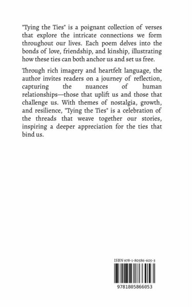 "Tying the Ties" is a poignant collection of verses that explore the intricate connections we form throughout our lives. Each poem delves into the bonds of love, friendship, and kinship, illustrating how these ties can both anchor us and set us free. Through rich imagery and heartfelt language, the author invites readers on a journey of reflection, capturing the nuances of human relationships-those that uplift us and those that challenge us. With themes of nostalgia, growth, and resilience, "Tying the Ties" is a celebration of the threads that weave together our stories, inspiring a deeper appreciation for the ties that bind us.