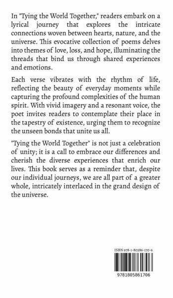 In "Tying the World Together," readers embark on a lyrical journey that explores the intricate connections woven between hearts, nature, and the universe. This evocative collection of poems delves into themes of love, loss, and hope, illuminating the threads that bind us through shared experiences and emotions. Each verse vibrates with the rhythm of life, reflecting the beauty of everyday moments while capturing the profound complexities of the human spirit. With vivid imagery and a resonant voice, the poet invites readers to contemplate their place in the tapestry of existence, urging them to recognize the unseen bonds that unite us all. "Tying the World Together" is not just a celebration of unity; it is a call to embrace our differences and cherish the diverse experiences that enrich our lives. This book serves as a reminder that, despite our individual journeys, we are all part of a greater whole, intricately interlaced in the grand design of the universe.