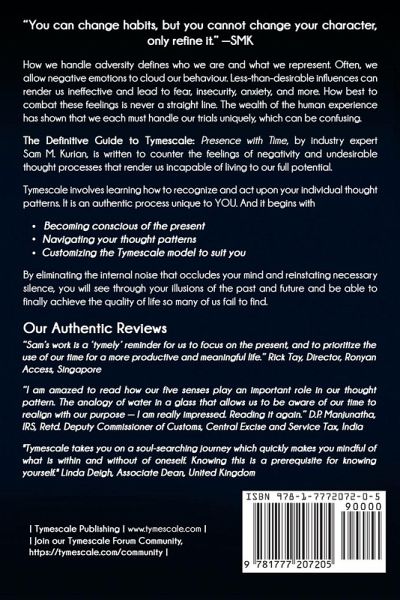 "You can change habits, but you cannot change your character, only refine it." -SMKHow we handle adversity defines who we are and what we represent. Often, we allow negative emotions to cloud our behaviour. Less-than-desirable influences can render us ineffective and lead to fear, insecurity, anxiety, and more. How best to combat these feelings is never a straight line. The wealth of the human experience has shown that we each must handle our trials uniquely, which can be confusing.The Definitive Guide to Tymescale: Presence with Time, by industry expert Sam M. Kurian, is written to counter the feelings of negativity and undesirable thought processes that render us incapable of living to our full potential.Tymescale involves learning how to recognize and act upon your individual thought patterns. It is an authentic process unique to YOU. And it begins withBecoming conscious of the present Navigating your thought patterns Customizing the Tymescale model to suit you By eliminating the internal noise that occludes your mind and reinstating necessary silence, you will see through your illusions of the past and future and be able to finally achieve the quality of life so many of us fail to find.