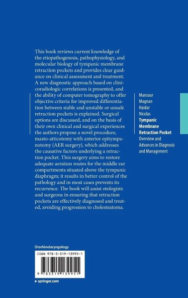 This book reviews current knowledge of the etiopathogenesis, pathophysiology, and molecular biology of tympanic membrane retraction pockets and provides clear guidance on clinical assessment and treatment. A new diagnostic approach based on clinicoradiologic correlations is presented, and the ability of computer tomography to offer objective criteria for improved differentiation between stable and unstable or unsafe retraction pockets is explained. Surgical options are discussed, and on the basis of their own clinical and surgical experiences the authors propose a novel procedure, masto-atticotomy with anterior epitympanotomy (AER surgery), which addresses the causative factors underlying a retraction pocket. This surgery aims to restore adequate aeration routes for the middle ear compartments situated above the tympanic diaphragm; it results in better control of the pathology and in most cases prevents its recurrence. The book will assist otologists and surgeons in ensuring thatretraction pockets are effectively diagnosed and treated, avoiding progression to cholesteatoma.
