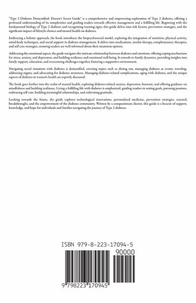 "Type 2 Diabetes Demystified: Doctor's Secret Guide" is a comprehensive and empowering exploration of Type 2 diabetes, offering a profound understanding of its complexities and guiding readers towards effective management and a fulfilling life. Beginning with the fundamental biology of Type 2 diabetes and recognizing warning signs, this guide delves into risk factors, prevention strategies, and the significant impact of lifestyle choices and mental health on diabetes. Embracing a holistic approach, the book introduces the biopsychosocial model, exploring the integration of nutrition, physical activity, mind-body techniques, and social support in diabetes management. It delves into medications, insulin therapy, complementary therapies, and self-care strategies, ensuring readers are well-informed about their treatment options. Addressing the emotional aspect, the guide navigates the intricate relationship between diabetes and emotions, offering coping mechanisms for stress, anxiety, and depression, and building resilience and emotional well-being. It extends to family dynamics, providing insights into family support, education, and overcoming challenges together, fostering a supportive environment. Navigating social situations with diabetes is demystified, covering topics such as dining out, managing diabetes at events, traveling, addressing stigma, and advocating for diabetes awareness. Managing diabetes-related complications, aging with diabetes, and the unique aspects of diabetes in women's health are expertly discussed. The book goes further into the realm of mental health, exploring diabetes-related anxiety, depression, burnout, and offering guidance on mindfulness and building resilience. Living a fulfilling life with diabetes is emphasized, guiding readers in setting goals, pursuing passions, embracing self-care, building meaningful relationships, and cultivating gratitude. Looking towards the future, the guide explores technological innovations, personalized medicine, prevention strategies, research breakthroughs, and the empowerment of the diabetes community. Written by a compassionate doctor, this guide is a beacon of support, knowledge, and hope for individuals and families navigating the journey of Type 2 diabetes.