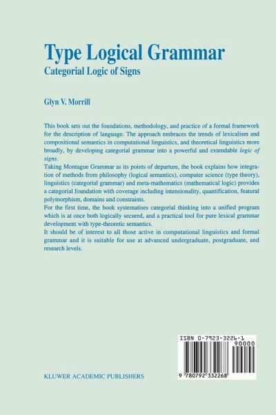 This is not quite the book I originally intended to write. Since I first felt that linguistic application of categorial grammar merited a system atic presentation, I have been subject to (what seemed to be) a series of demanding technical and foundational distractions. Inspite of a prej udice that mathematical elegance was even inconsistent with linguistic practicality, repeated illumination of the latter by the former implied a new perspective on the field, one prompting formal innovation, and some re-examination of methods and goals. This piece collects and extends work over the last four years general ising categorial grammar to a categorial logic. The state of the art at the beginning of that period was represented by the edited collections Oehrle, Bach and Wheeler (1988) and Buszkowski, Marciszewski and van Benthem (1988) (see Morrill 1991a, b), and by Moortgat (1988b). Familiarity with such work however is not strictly necessary for an un derstanding of the present one, which attempts to map a self-contained, if intensive, course with Montague Grammar as its point of departure. This being the case, the reader should have an understanding of logical semantics and its technicalities, such as would be obtained from Dowty, Wall and Peters (1981), or Gamut (1991). Some familiarity with the issues raised by contemporary syntactic theories would also be useful, as would some familiarity with logical deduction.