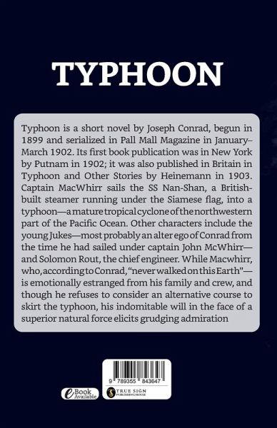 Typhoon is a short novel by Joseph Conrad, begun in 1899 and serialized in Pall Mall Magazine in January-March 1902. Its first book publication was in New York by Putnam in 1902; it was also published in Britain in Typhoon and Other Stories by Heinemann in 1903. Captain MacWhirr sails the SS Nan-Shan, a British-built steamer running under the Siamese flag, into a typhoon-a mature tropical cyclone of the northwestern part of the Pacific Ocean. Other characters include the young Jukes-most probably an alter ego of Conrad from the time he had sailed under captain John McWhirr-and Solomon Rout, the chief engineer. While Macwhirr, who, according to Conrad, ""never walked on this Earth""-is emotionally estranged from his family and crew, and though he refuses to consider an alternative course to skirt the typhoon, his indomitable will in the face of a superior natural force elicits grudging admiration