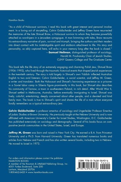 This book tells the life story of an extremely engaging and charming Polish Jew, Shmuel Braw (1906-1992), who lived through the traumatic historical events that shaped Jewish experiences in the twentieth century. The story is told largely in Shmuel's own Yiddish- inflected Australian English to two avid listeners: Calvin Goldscheider, a social scientist, and Jeffrey M. Green, a writer and translator. Both the Holocaust and Shmuel's harrowing experience as a prisoner in a Soviet labor camp in Siberia figure prominently in this book, but Shmuel also describes his community of Tarnow, a town in southeastern Poland, in rich detail. After World War II, Shmuel settled in Melbourne, Australia before eventually immigrating to Israel. Shmuel was lively, colorful, entertaining, deeply concerned about other people, and a devoted and kind family man. The book is true to Shmuel's spirit and shares the life of a man whom everyone fondly remembers as a typical extraordinary Jew.